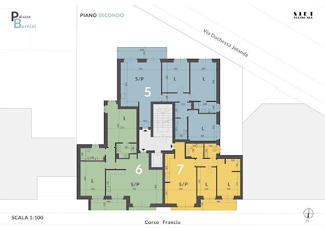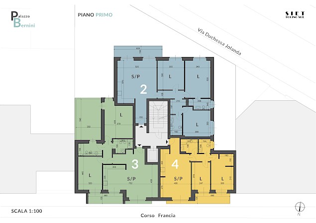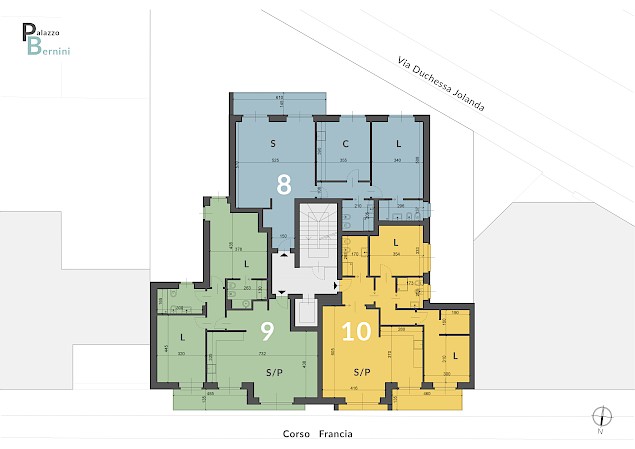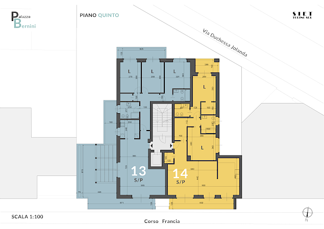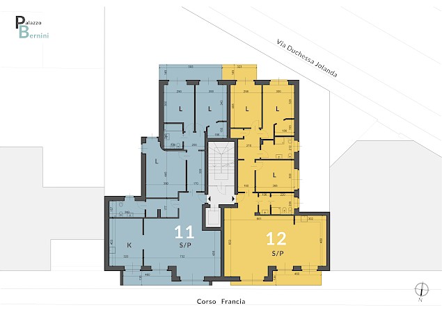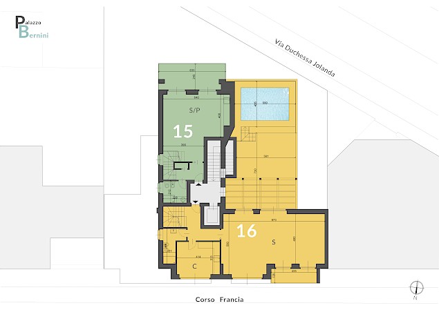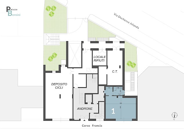 Locali tecnici (deposito bici, centrale termica e locale rifiuti) e un ufficio composto da ingresso, bagno, ampio locale con affaccio su corso Francia, cantina di pertinenza (superficie commerciale mq. 54)